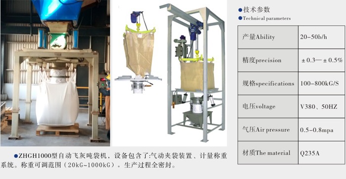 ZHGH1000型自動(dòng)飛灰噸袋機(jī),設(shè)備包含了:氣動(dòng)夾袋裝置、計(jì)量稱(chēng)重系統(tǒng),稱(chēng)重可調(diào)范圍(20KG至1000KG)。
